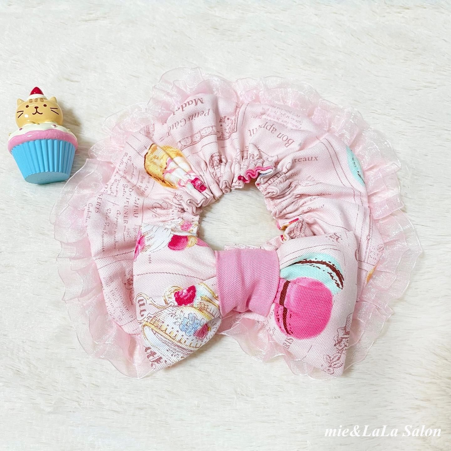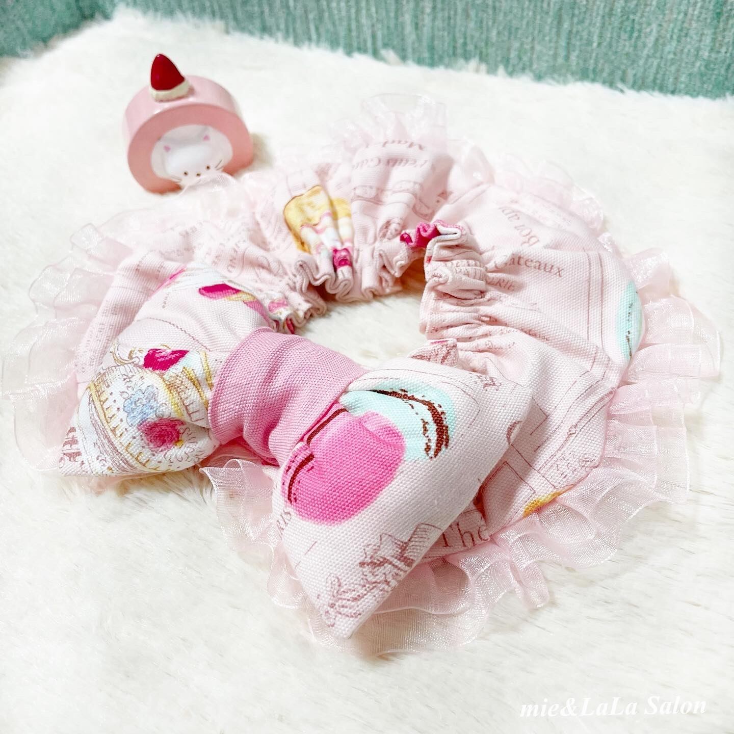ピンクのスイーツ柄の生地にオーガンジーフリルを仕立て、ビッグリボンをお付けしました♡