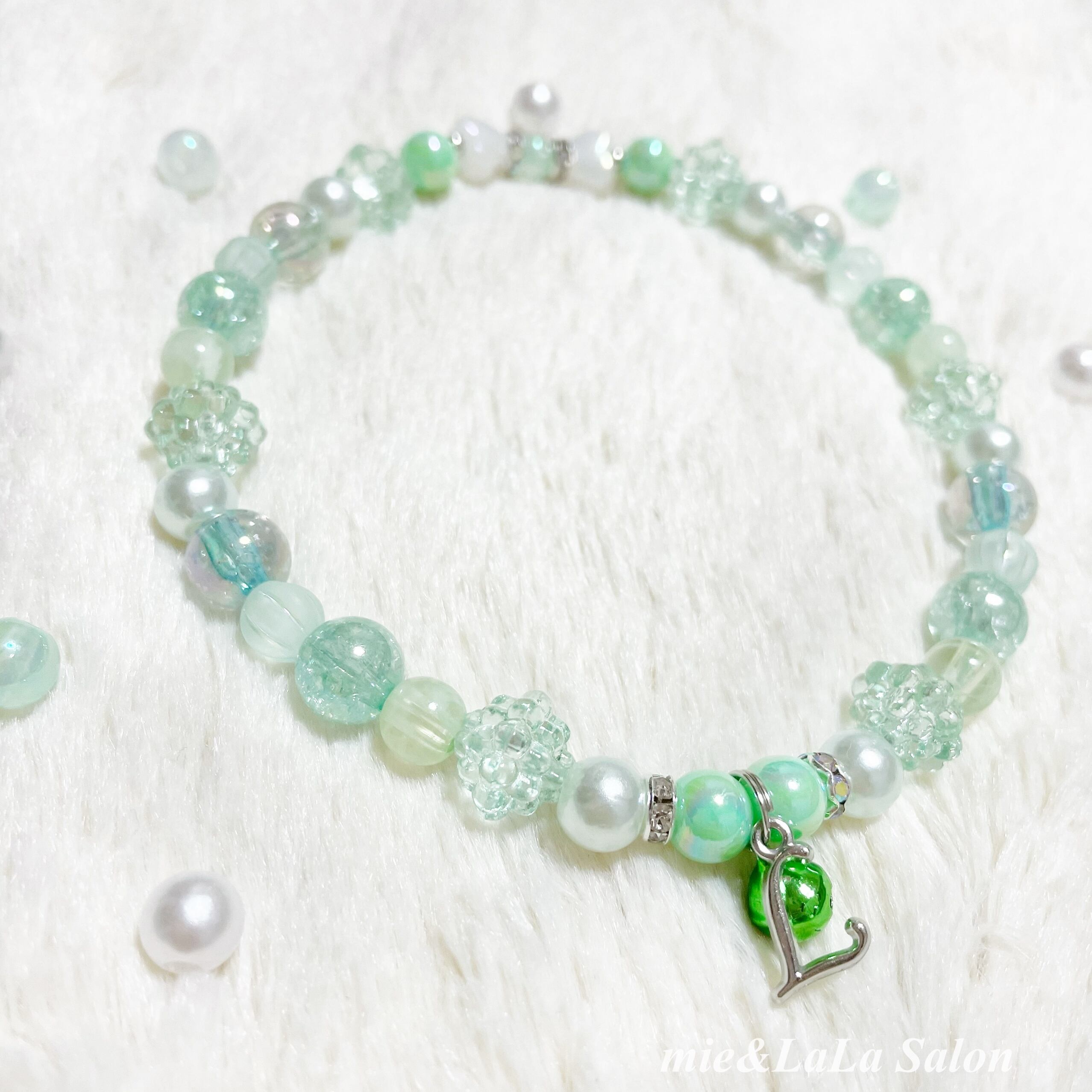 エメラルドグリーンのネックレスにイニシャルチャームと鈴をお付けしました˚✧₊⁎
