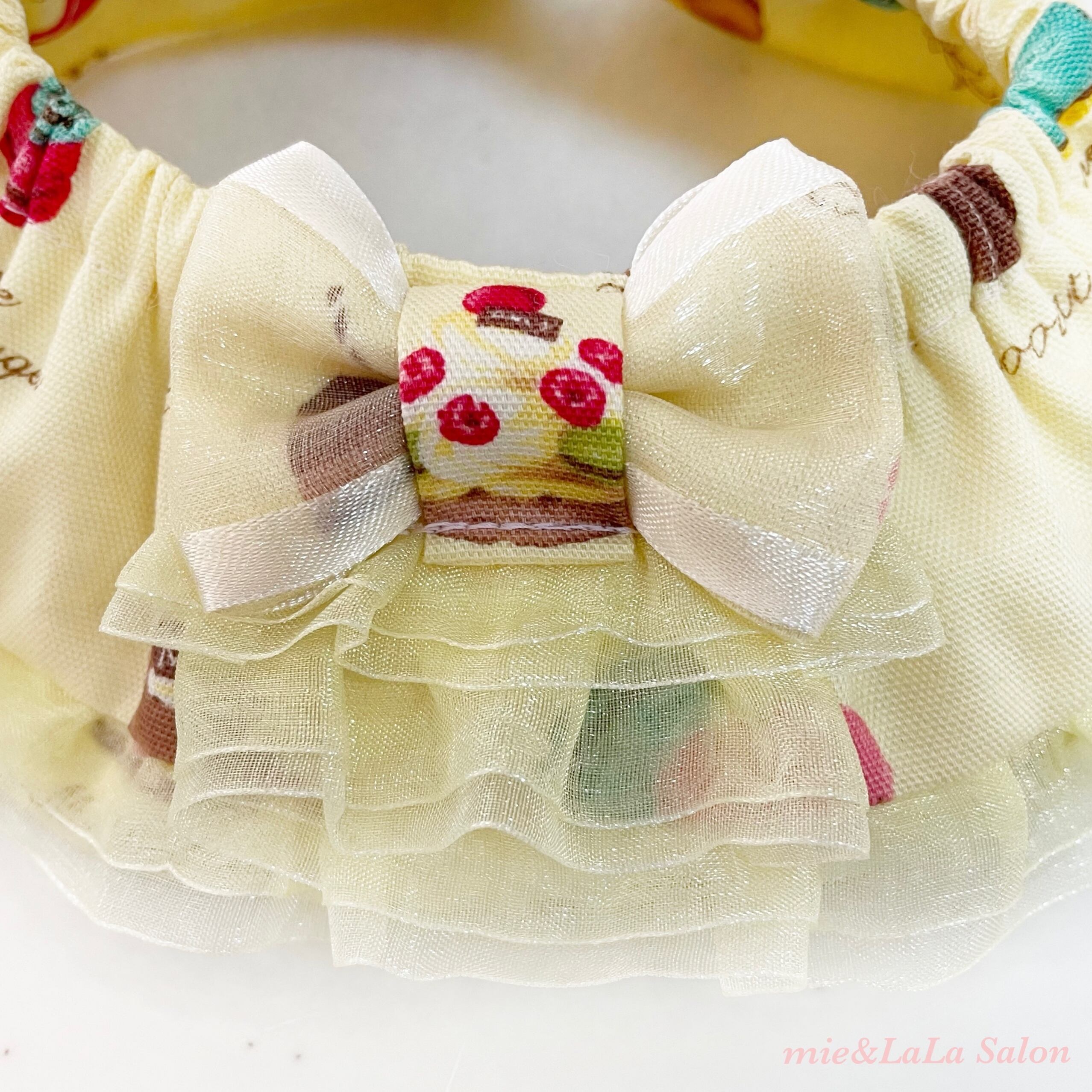 スイーツ柄の生地にフリルレースを仕立て、リボンをお付けしました♡