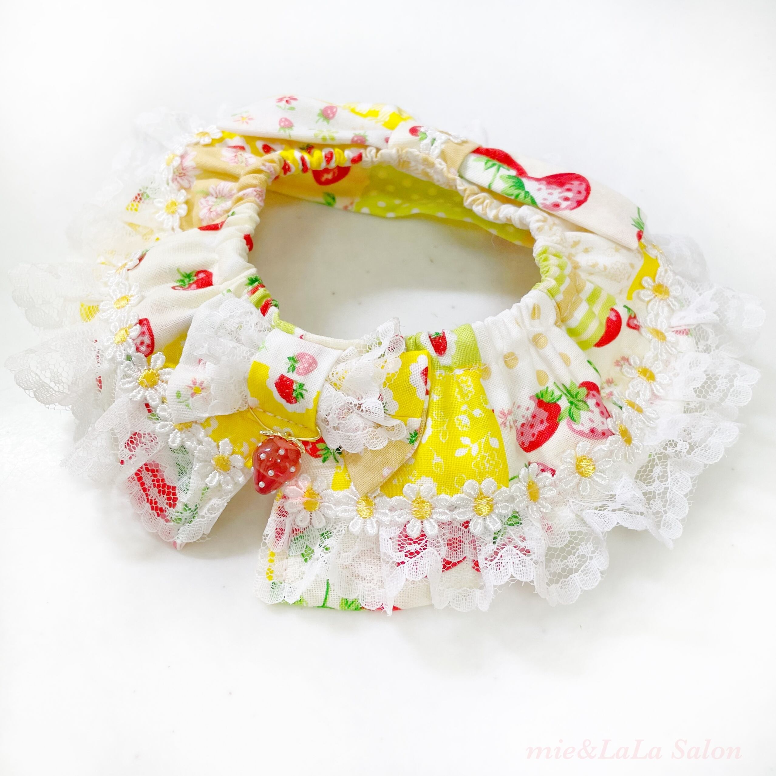 いちごとお花のフリル2way襟シュシュ首輪♡イエロー 大きなリボンシリーズ ペット用 犬 猫 うさぎ
