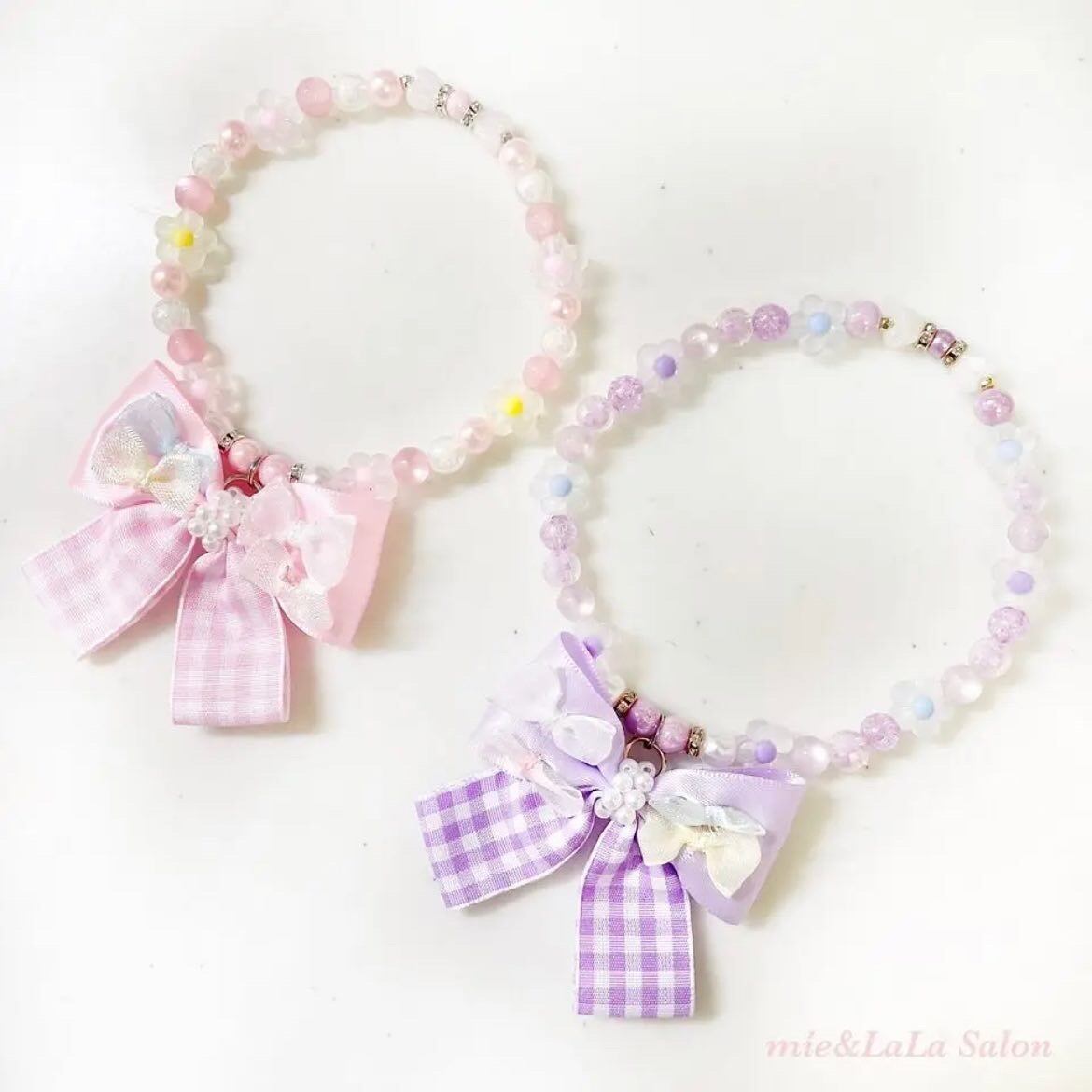 お花のネックレスにリボンリボンチャームを