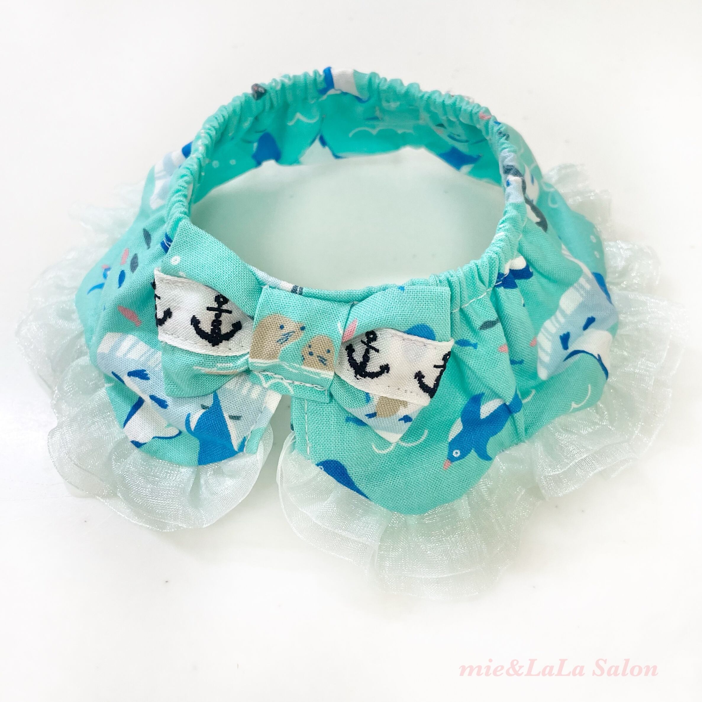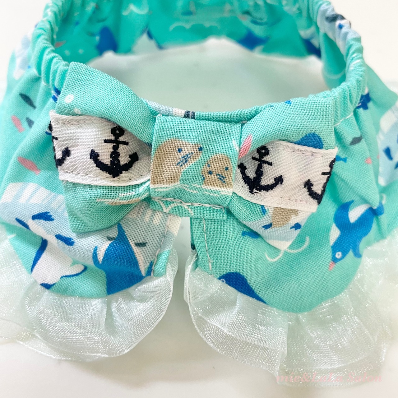 ペンギンさんフラワー型襟シュシュ首輪୨୧ターコイズブルー ペット用 犬 猫 うさぎ