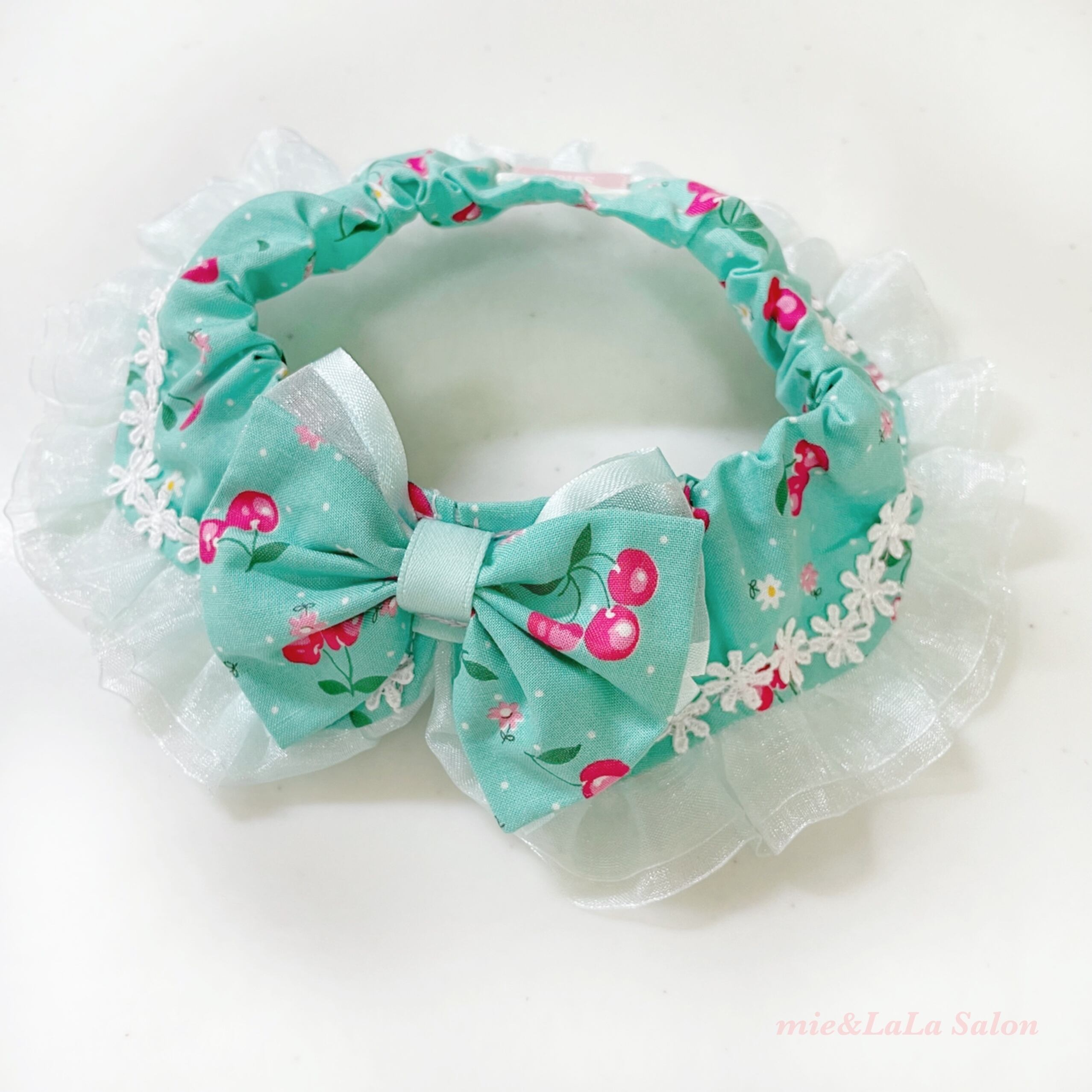 ミニさくらんぼフラワー型フリル襟シュシュ首輪 ミントグリーン ペット用 犬 猫 うさぎ